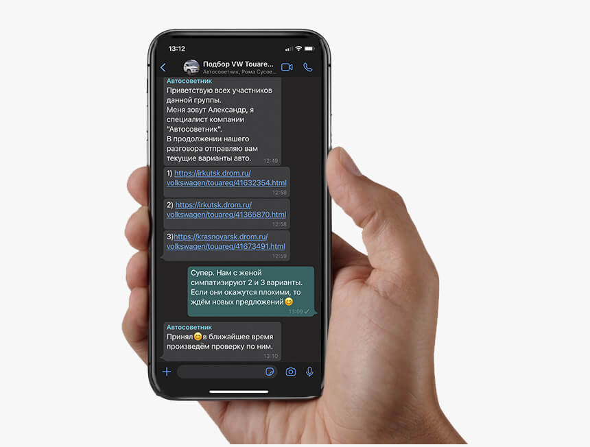 Он создаст рабочий чат в любом удобном для вас мессенджере. Добавит в него старшего автоэксперта, вас и всех людей, кто хочет участвовать в покупке авто.